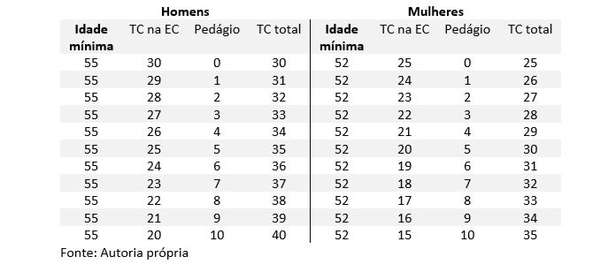 § 1º Para o professor que comprovar exclusivamente tempo de efetivo exercício das funções de magistério na educação infantil e no ensino fundamental e médio serão reduzidos, para ambos os sexos, os requisitos de idade e de tempo de contribuição em 5 (cinco) anos (BARROSO e JUNIOR 2021)Desta forma, temos a seguinte tabela sintetizando essa regra de transição para o professor: